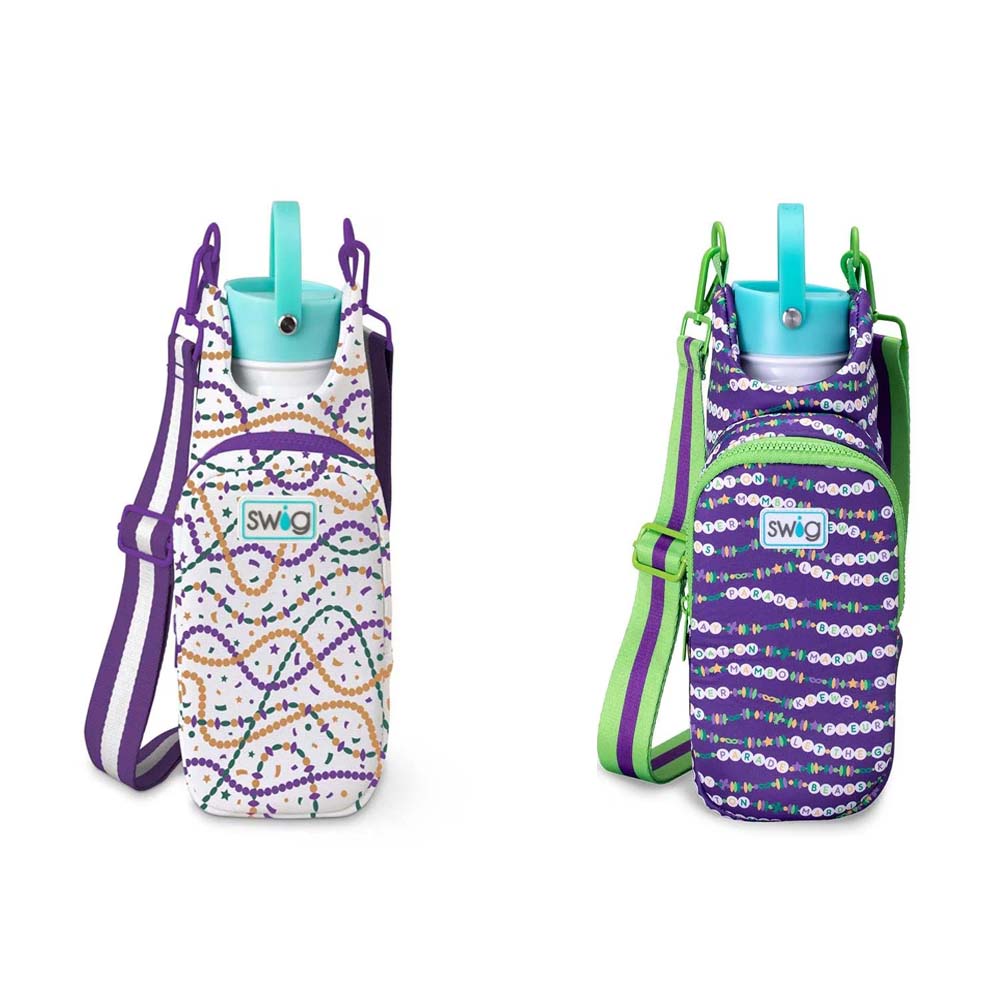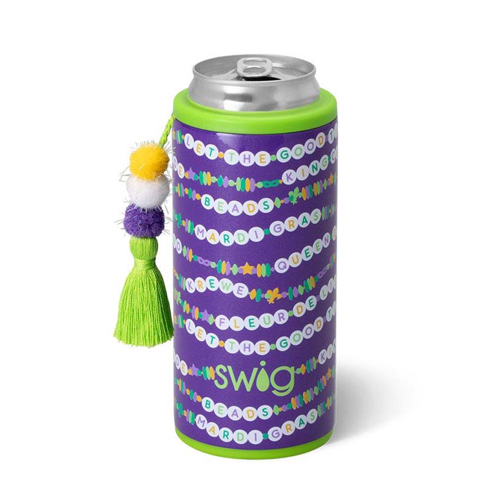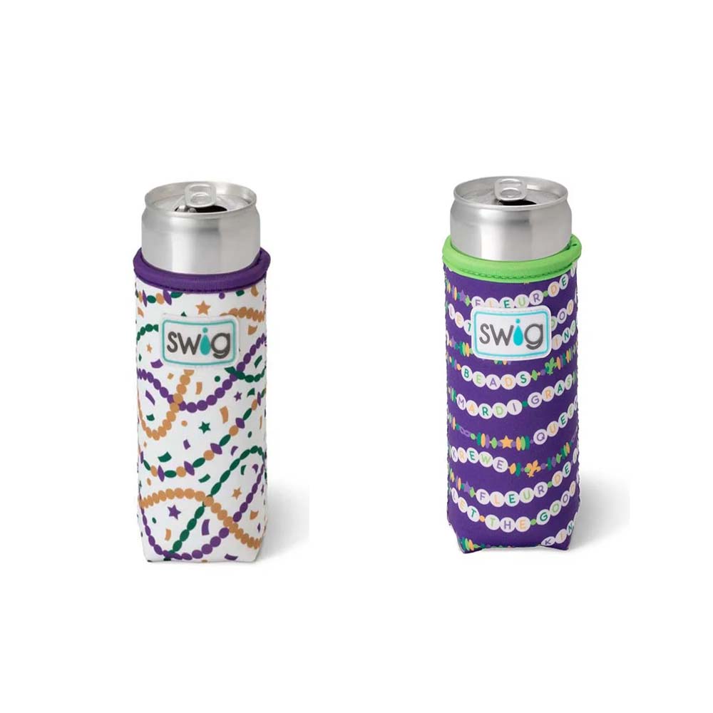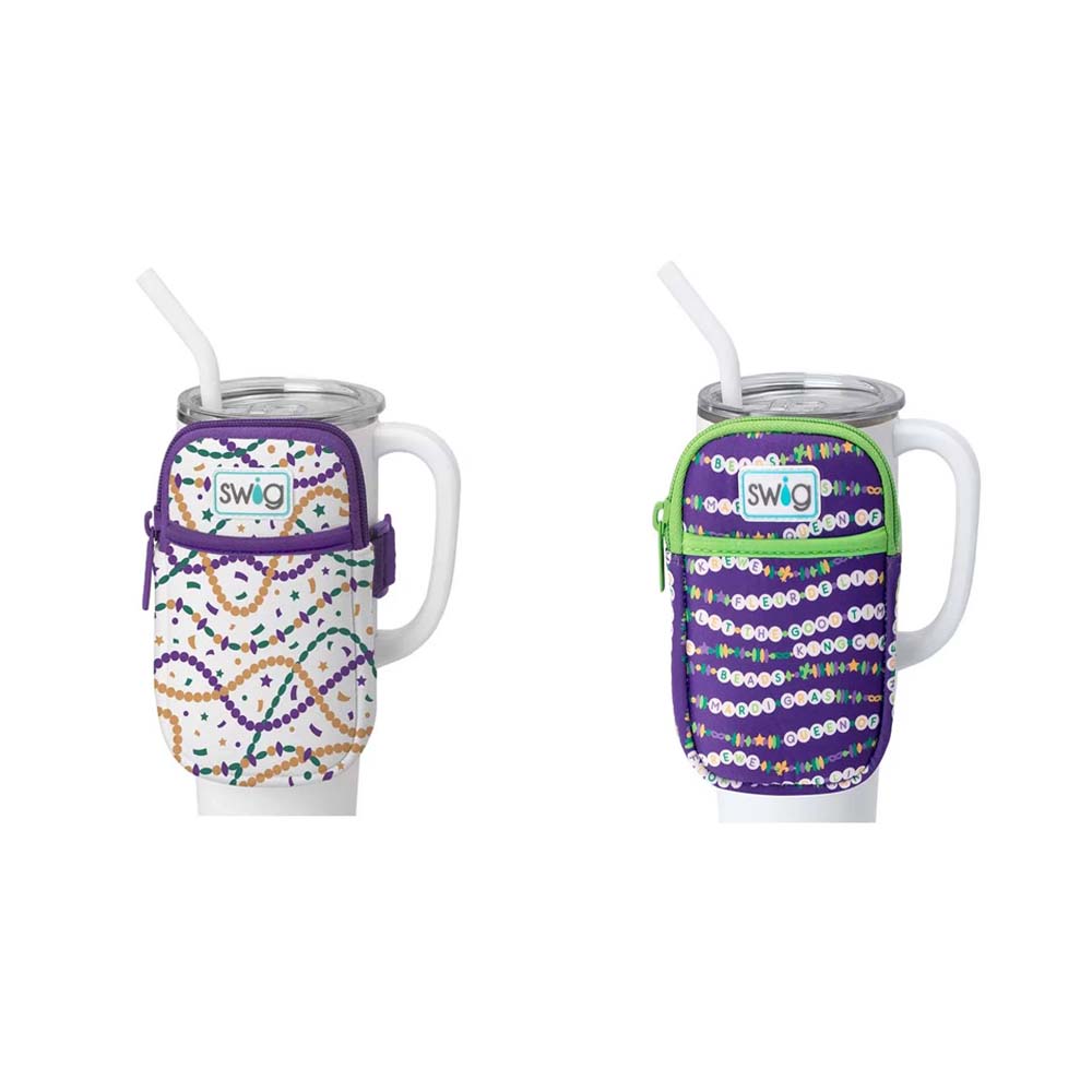 Cool drinks, dry hands! 2 designs-🍺 Mardi on with parade-ready print! on one, And🍺 Cue the beads! Embrace your Mardi Gras Era with these festive friendship bracelets on a glitter lilac background, on the other!