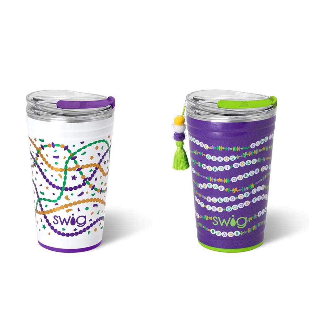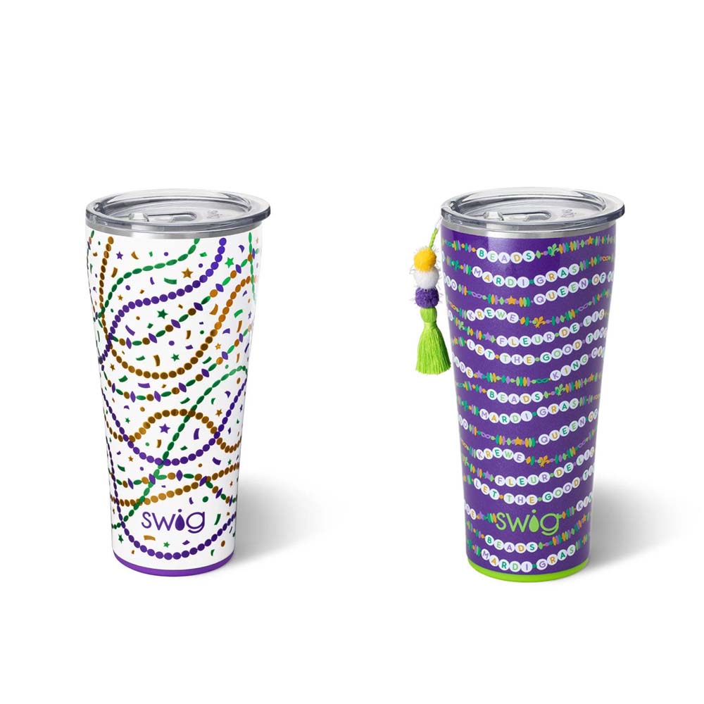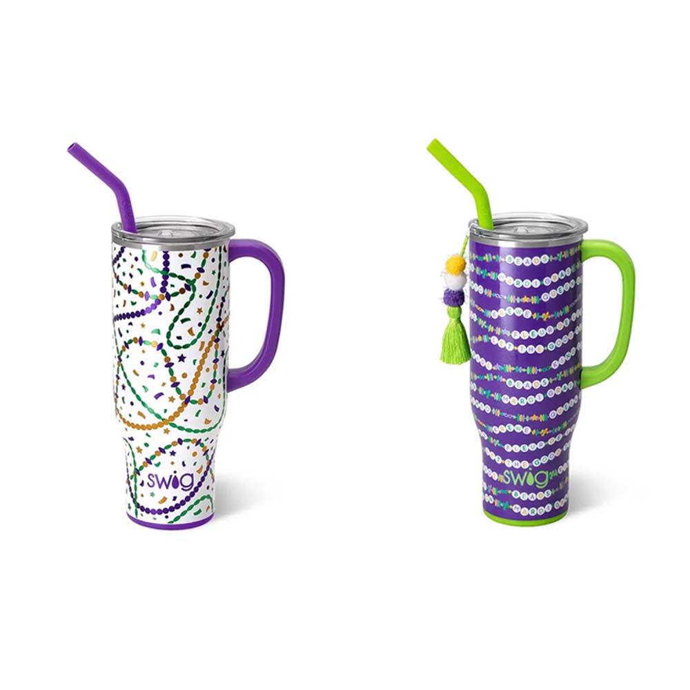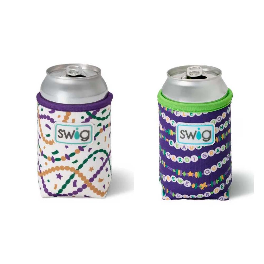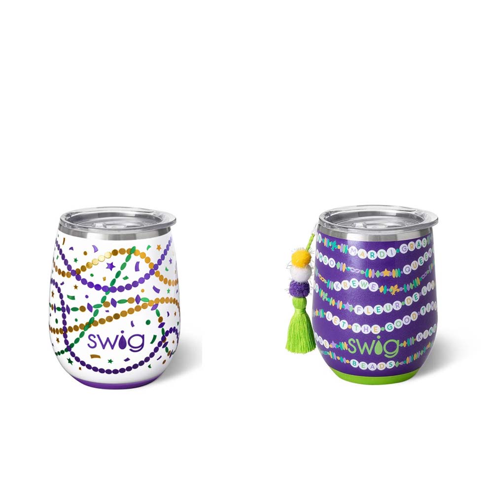 Cool drinks, dry hands! 2 designs-🍺 Mardi on with parade-ready print! on one, And🍺 Cue the beads! Embrace your Mardi Gras Era with these festive friendship bracelets on a glitter lilac background, on the other!