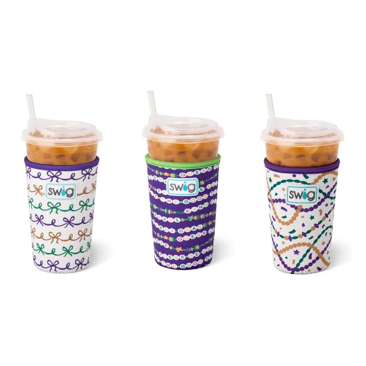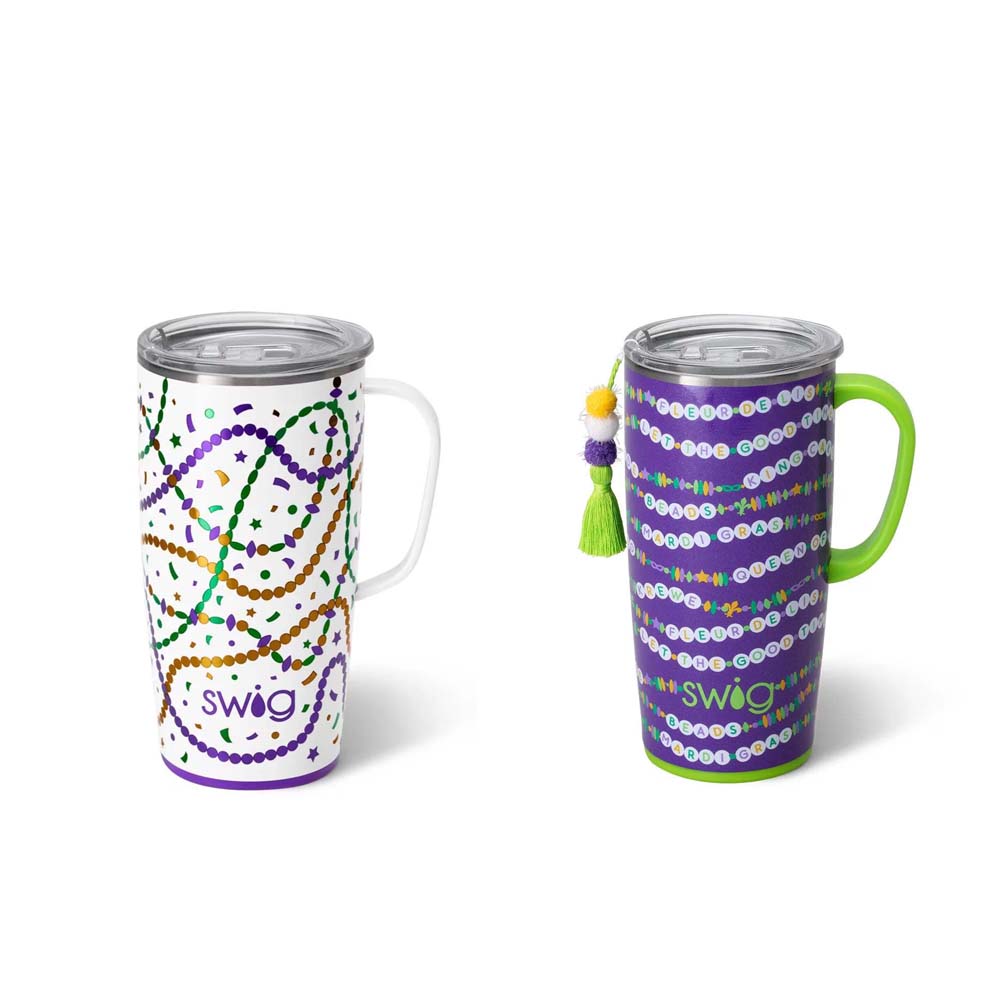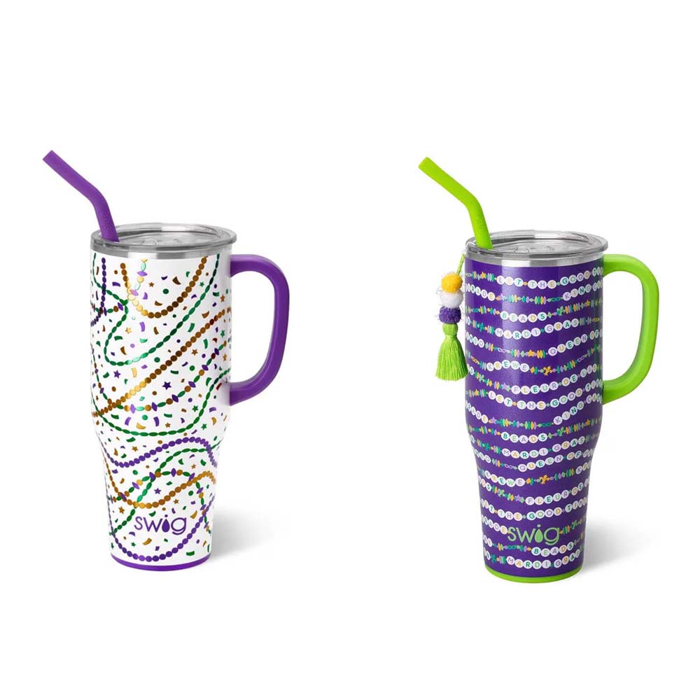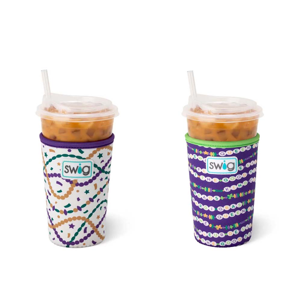 Cool drinks, dry hands! 2 designs-🍺 Mardi on with parade-ready print! on one, And🍺 Cue the beads! Embrace your Mardi Gras Era with these festive friendship bracelets on a glitter lilac background, on the other!